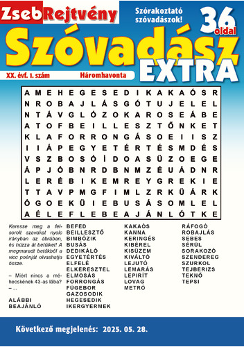Kedveli a szóvadász rejtvényeket? Jöhet egy-két különleges feladvány is? A ZsebRejtvény Szóvadász Extra lapban nem fog csalódni! Megjelenik negyedévente 36 rejtvénnyel.